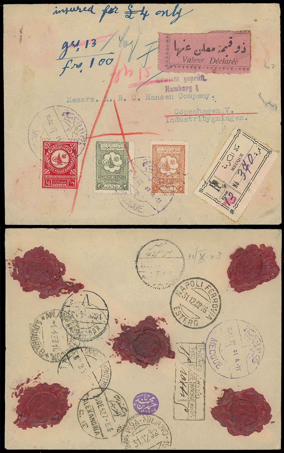 1984 c, entire, etc. imageSaudi Arabia: Hejaz and Nejd: 1932 (Dec. 20) colourful registered cover from Mecca to Copenhagen with registration and pink “Valeur Déclarée” labels, endorsed “insured for £4 only”, franked by 1927 (Jan.) 1/8pi. yellow-brown, 3pi. olive-green and 1932 1/2g. scarlet cancelled by violet double ring c.d.s’s, with red wax seals, transit and arrival datestamps on reverse. Photo. (Image1)