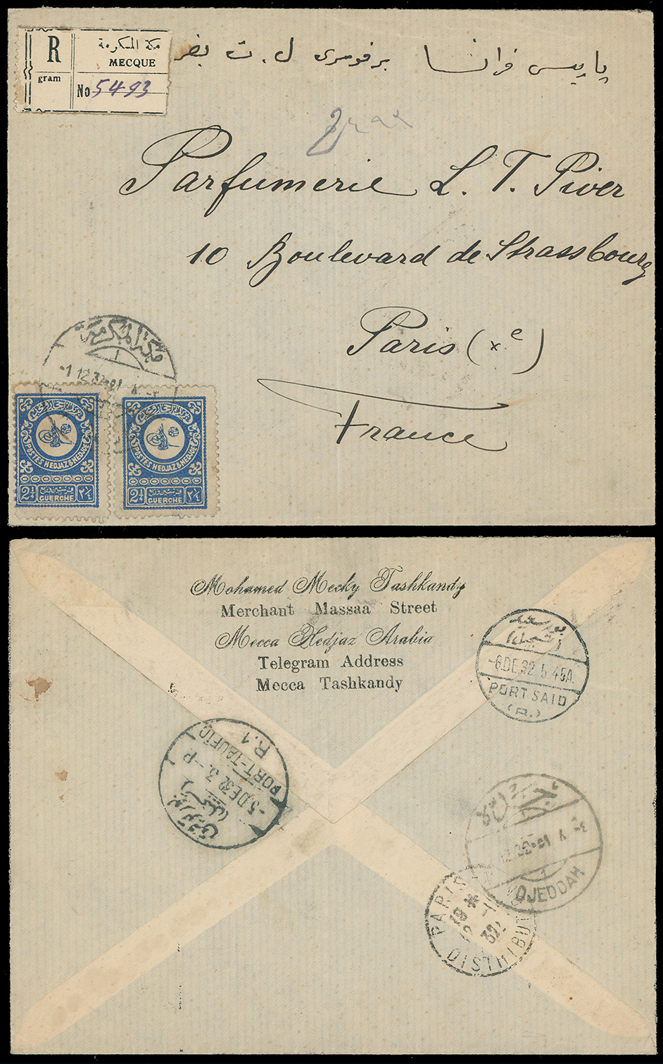1983 c, entire, etc. imageSaudi Arabia: Hejaz and Nejd: 1932 (Dec. 1) registered cover to Paris with Mecca registration label, franked 1932 21/4g. blue (2)cancelled by bilingual double ring, backstamped Jeddah, Port Taufiq, Port Said and Dec. 12 arrival. (Image1)