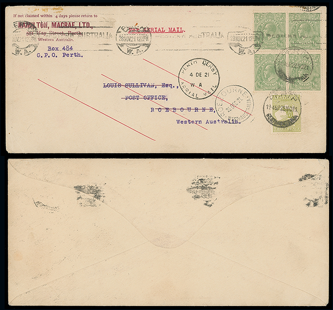424 c, entire, etc. imageAustralia: Crash Mail: 1921 (Nov. 28) envelope “per Aerial Mail” to Roebourne franked K.G.V 1/2d. block of four and 3d. Kangaroo tied by Perth machine and c.d.s. with special cachet and Roebourne arrival c.d.s. below. Crashed en route at Murchison House Station killing two occupants. 52 surviving covers recorded which were flown back to Perth and subsequently sent by surface mail. Eustis 56a. Photo. (Image1)