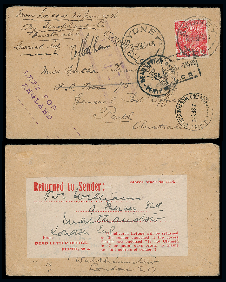426 c, entire, etc. imageAustralia: Crash Mail: 1926 (June 24) envelope “By Aeroplane to Australia” to Perth “carried by” with signature of pilot Cobham alongside, the addressee endorsed as “LEFT FOR/ENGLAND” and with Perth G.P.O. printed “Returned to Sender” (to London) label affixed to the reverse. Cobham flew from the River Medway, Kent and during a dust storm between Baghdad and Basra was forced to fly at a height of about 40 feet, resulting in being shot at with his engineer Arthur Elliott killed as a result. He was replaced by a Sgt Ward at Basra for the balance of the journey to Melbourne from where this cover was sent to Perth. A tragic and exceedingly rare flight cover with only ten signed examples believed to have made. Important exhibition item. Eustis 96. Photo. (Image1)