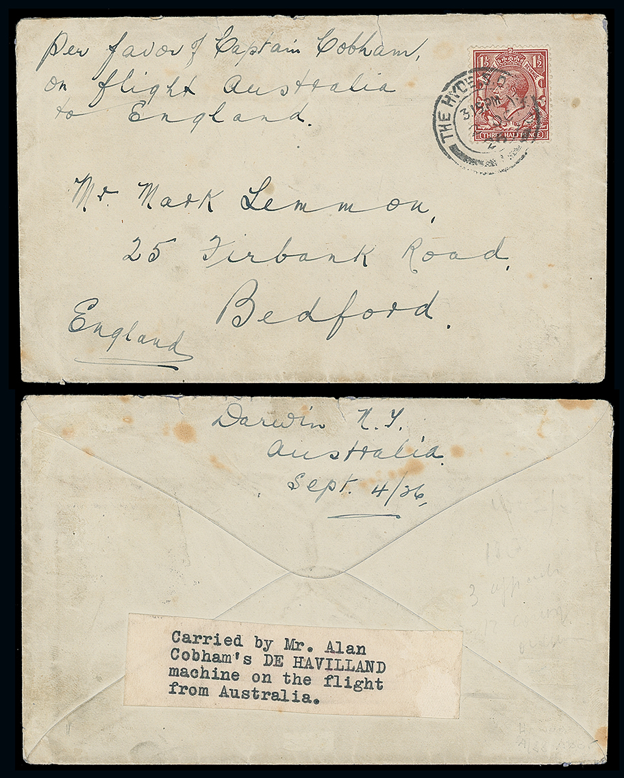 427 c, entire, etc. imageAustralia: Crash Mail: 1926 (Sept. 8) envelope “per favour of Captain Cobham/on flight Australia/to England” to Bedford, posted on arrival in London franked G.B. 11/2d. tied by a Hyde S.O. c.d.s. and with typed label “Carried by Mr. Alan/Cobham’s DE HAVILLAND/machine on the flight/from Australia” affixed to reverse. The flight, originating in Darwin, subject to a forced landing at Phuket (Siam) and further delays in Burma at Victoria Point and Rangoon due to tropical storms, very scarce with only 18 covers carried. Photo. (Image1)