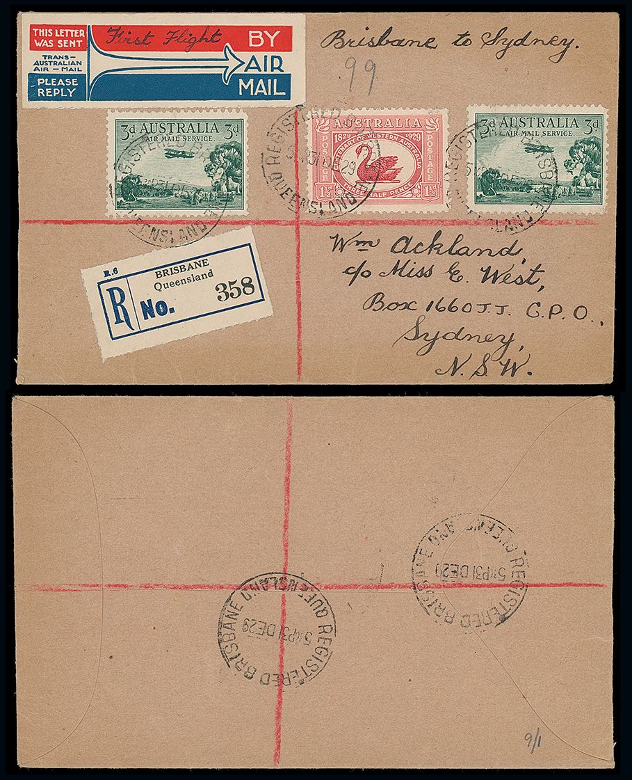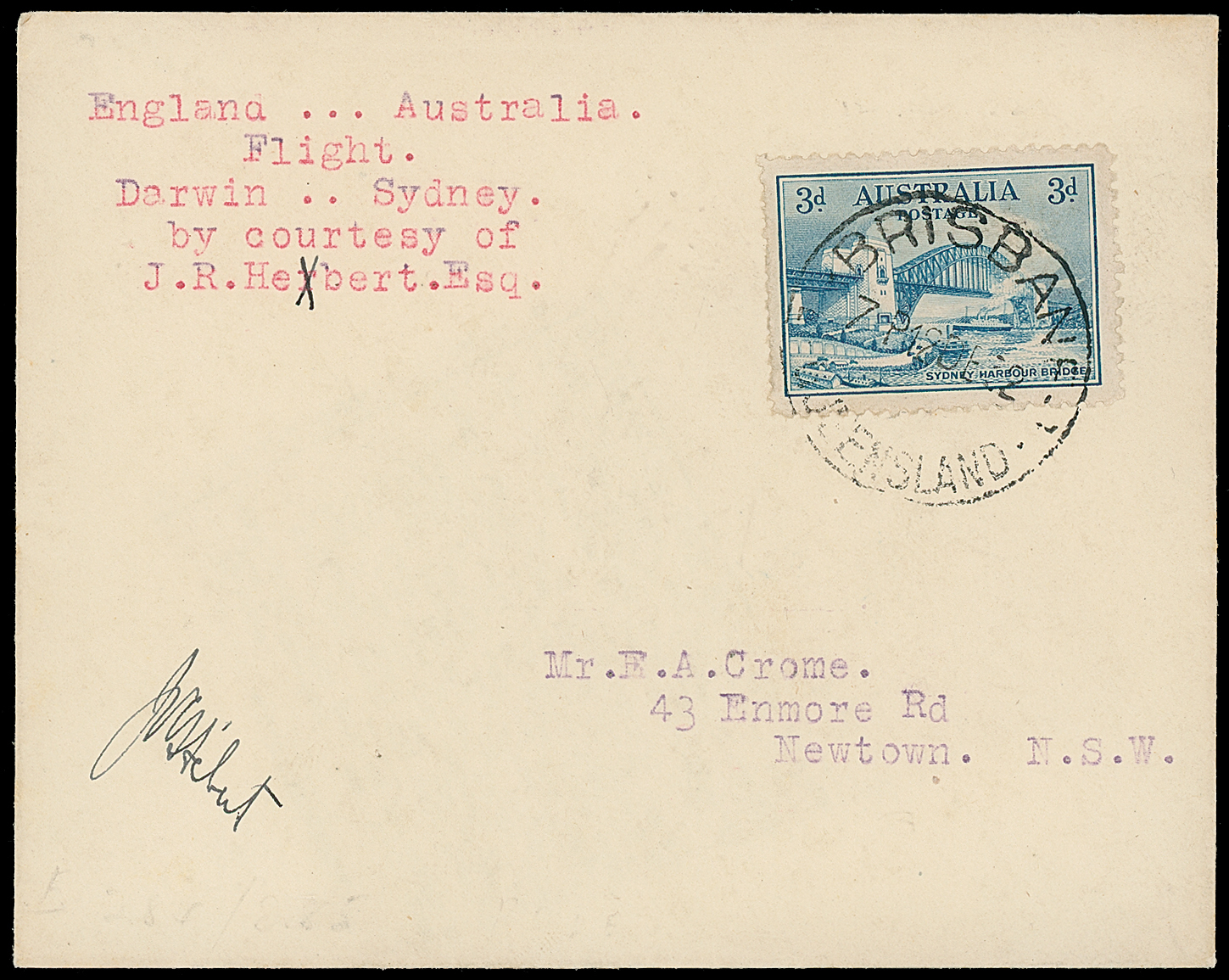 429 c, entire, etc. imageAustralia: Crash Mail: 1932 (Dec. 12) pilot-signed envelope “England-Australia/Flight/Darwin-Sydney/by Courtesy of/J.R.Hebert. Esq.” to Sydney franked 3d. tied by Brisbane c.d.s. Carried from England and upon leaving Darwin made a forced landing in paddock due to being unable to find the airfield, overturning in order to miss a herd of goats and damaging the fuselage and wings. The wreck was sold to QANTAS upon rescue and the mail proceeded to Brisbane. Rare, just three covers flown from Darwin to Sydney. Photo. (Image1)