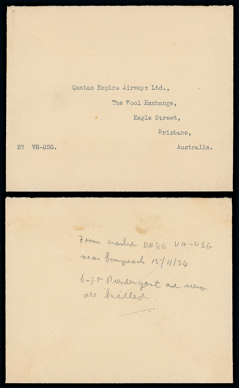 430 c, entire, etc. imageAustralia: Crash Mail: 1934 (Nov. 15) hand-carried envelope to Brisbane “By VH-USG” from England endorsed on reverse by Sir Hudson Fysh “From Crashed DH86b VH-USG/near Longreach 15/11/34/Capt Prendergast and crew/all killed”. The flight was a delivery flight to QANTAS and the crash due to carrying a spare engine on the back of the plane affecting the centre of gravity and by a failed forward fin”. The only example recorded. Photo. (Image1)