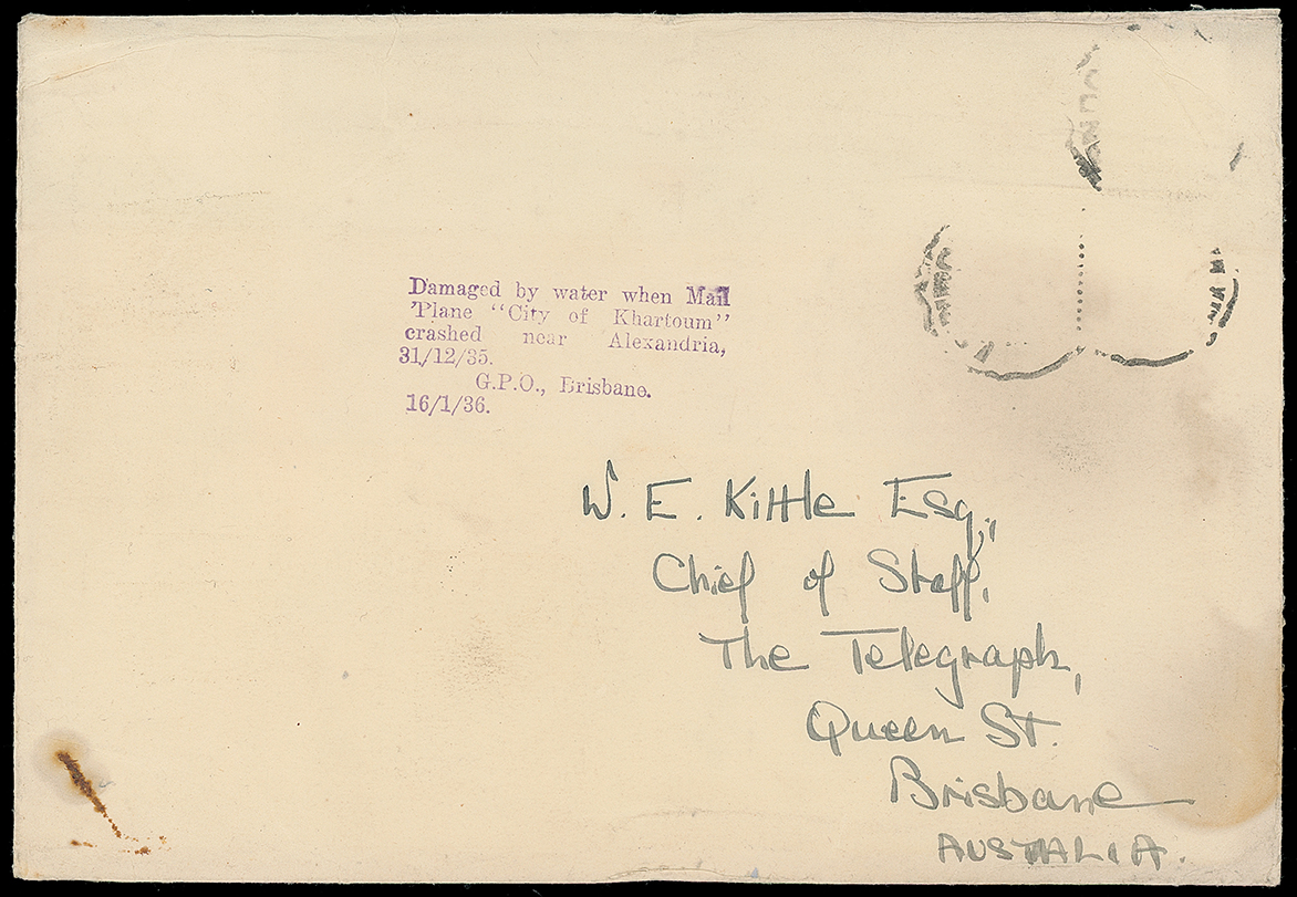 434 c, entire, etc. imageAustralia: Crash Mail: 1935 (Dec. 31) envelope to Brisbane from London (all three stamps missing) with Brisbane G.P.O. explanatory cachet for “City of Khartoum” crash near Alexandria and a similar typed label used on mail from this incident. Photo. (Image1)