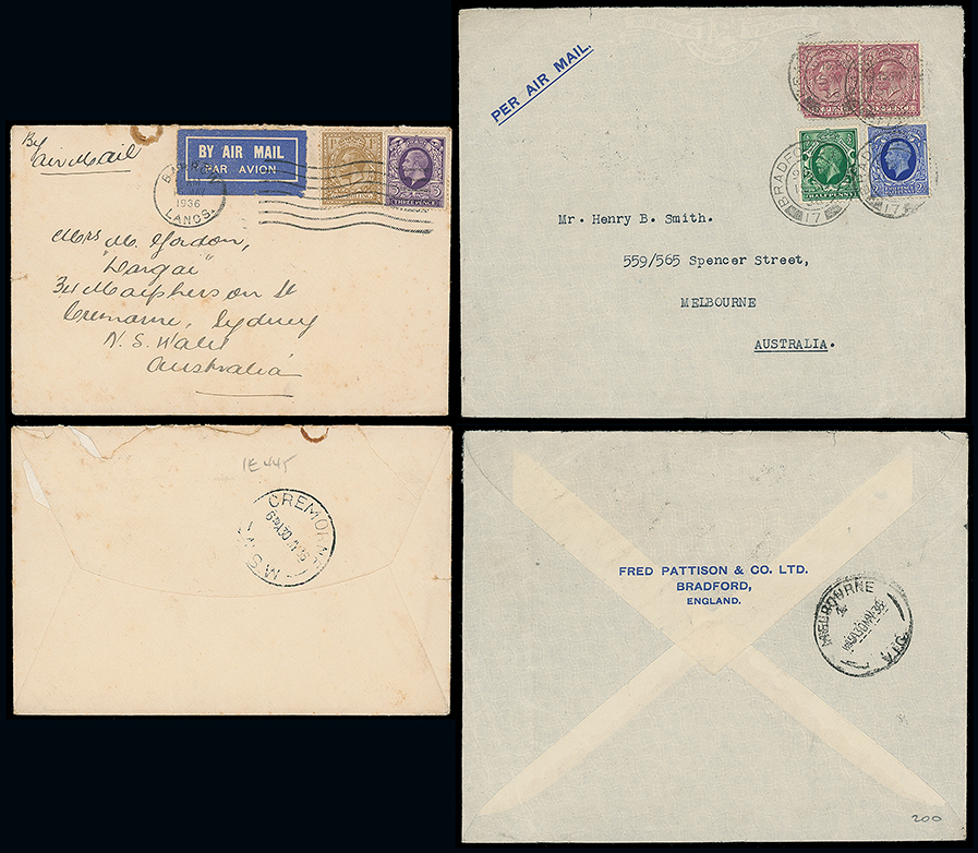 436 c, entire, etc. imageAustralia: Crash Mail: 1936 (May 24) envelopes to Sydney or Melbourne franked G.B. ½d., 2½d. and 6d. pair or 3d. and 1s. Carried on the Armstrong Whitworth AW15 “Aurora” which developed engine troubles at Penang from which the mail and passengers were transferred at Singapore to the “RMA Brisbane”. (2 items) Photo (Image1)