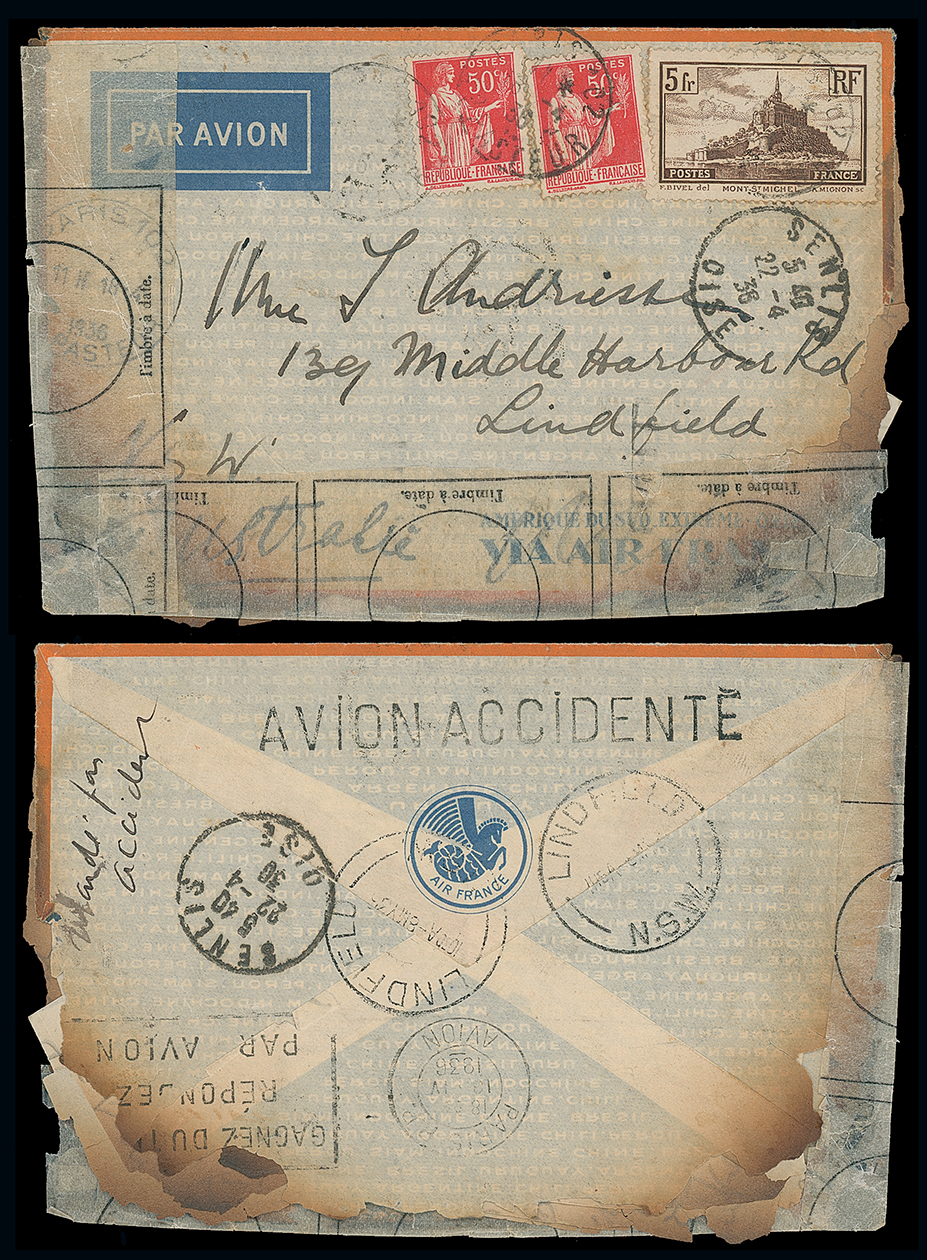 435 c, entire, etc. imageAustralia: Crash Mail: 1936 (Apr. 18) charred and repaired envelope to Sydney franked France 50c. (2) and 5f. tied by Paris c.d.s., the reverse with “AVION ACCIDENTE” mark. Crashed on a night flight from Le Bourget en route to Brussels with occupants killed, salvaged mail postmarked at Senlis where repaired and forwarded. The only example of mail from this incident to Australia. Photo. (Image1)