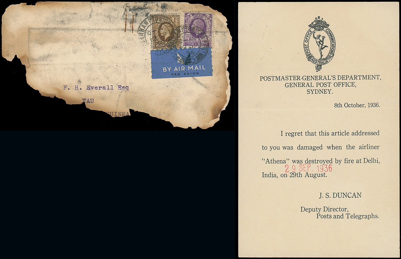 437 c, entire, etc. imageAustralia: Crash Mail: 1936 (Sept. 29) severely charred envelope to Wau, New Guinea, franked G.B. 3d. and 1s. tied by Wolverhampton c.d.s., with printed Sydney G.P.O. explanatory label (type K). Carried on Imperial Airways “Athena” destroyed en route by fire at Delhi , the mail forwarded by Dutch steamer “Van Rees” to Port Moresby. The only example of mail from this incident to Papua or New Guinea. Ex Kelly and Grey. Eustis 105a and illustrated by him at page 252. Photo. (Image1)
