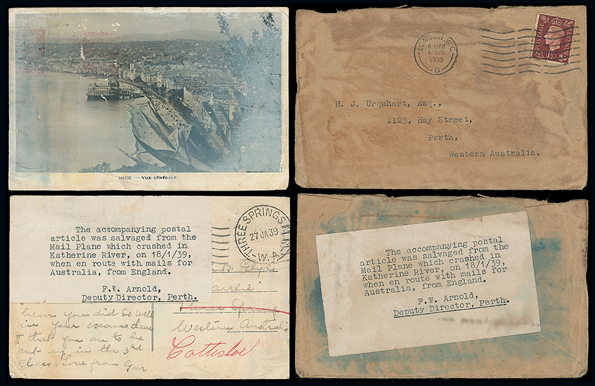 440 c, entire, etc. imageAustralia: Crash Mail: 1939 (Jan. 6, 18) postcard and cover to Perth from G.B., both with typed (two slightly different types from the sheet of twelve printed) official explanatory labels affixed. Carried on the Guinea Airways Lockheed “Koranga” which crashed into the Katherine River between Darwin and Adelaide. (2 items) Photo. (Image1)