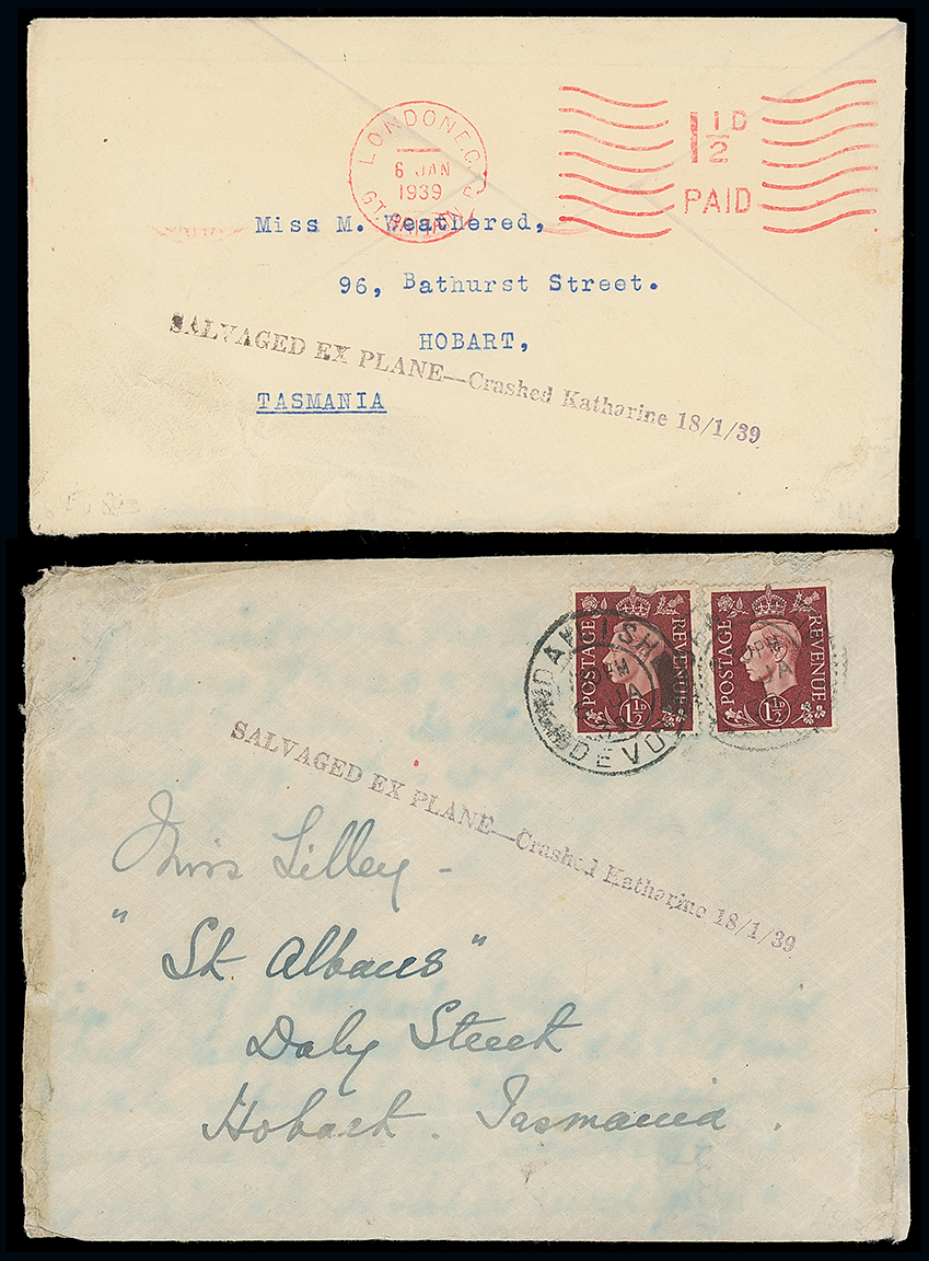 441 c, entire, etc. imageAustralia: Crash Mail: 1939 (Jan. 6) two envelopes to Hobart with London meter mark or 11/2d. (2) franking respectively, with ”SALVAGED EX PLANE - Crashed Katharine 18/1/39” cachet in grey (shades). Both carried on the Guinea Airways Lockheed “Koranga” which crashed into the Katherine River between Darwin and Adelaide. (2 items) Photo. (Image1)