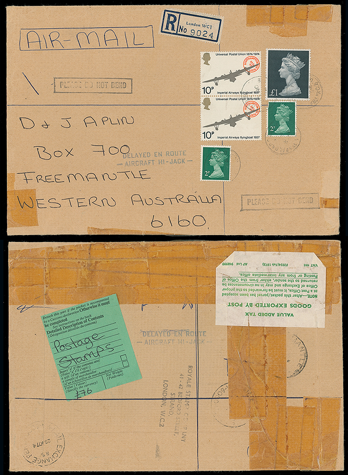 422 c, entire, etc. imageAustralia: 1974 (Nov.) airmail envelope to Freemantle (Western Australia) franked Mackin 2p. (2) and £1, and 10p. U.P.U. pair tied by Trafalgar Square c.d.s. with London WC1 registration label and “DELAYED EN ROUTE/-AIRCRAFT HI-JACK -”. The flight hijacked at Dubai and flown to Tunisia. Mail eventually recovered and with a Perth transit c.d.s on reverse. As at Jan. 2000, 42 examples of this mark were recorded of which this is the only registered article. Photo. (Image1)