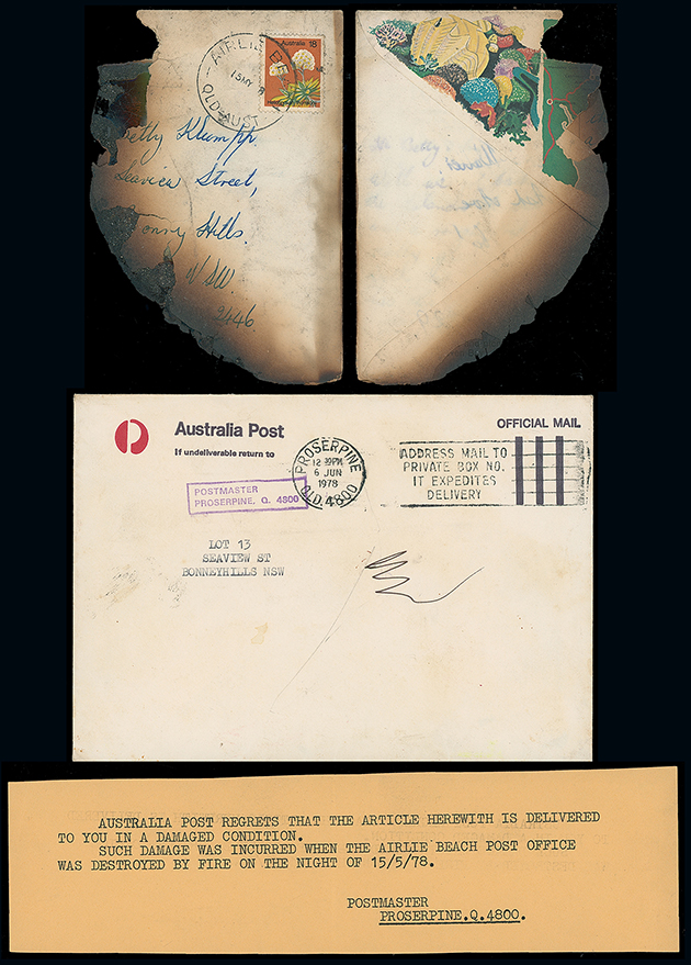 423 c, entire, etc. imageAustralia: 1978 (May 15) much reduced and charred envelope to Bonny Hills (N.S.W.) franked 18c. tied by Airlie Becah c.d.s. with typed explanatory slip from the Postmaster at Prosperine attributing blame to a fire at Airlie Beach P.O. and with matching official ‘ambulance’ envelope. The only example believed to exist. Photo. (Image1)