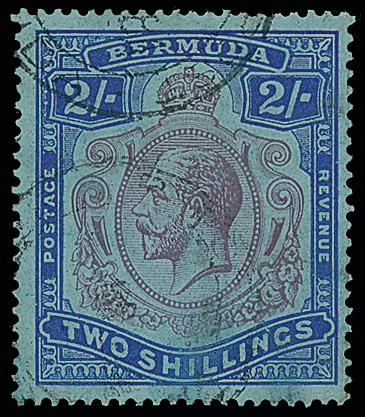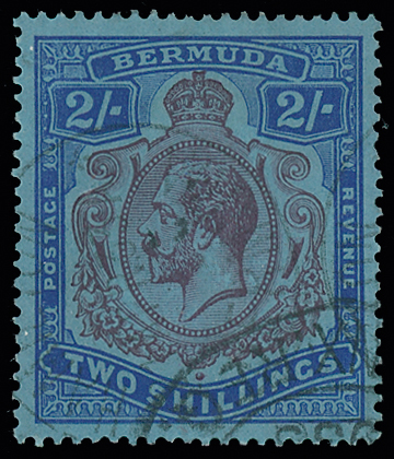 Bermuda: 1924-32 Watermark Mult. Script CA 2s. purple and blue on grey-blue, variety break in scroll, used, fine. S.G. 88ga, cat. £450. Photo. (Image1)