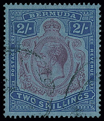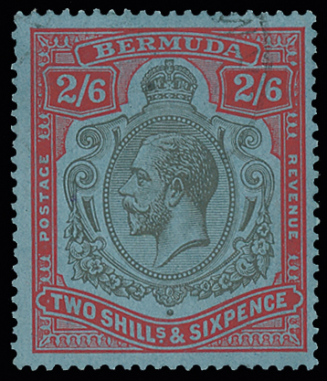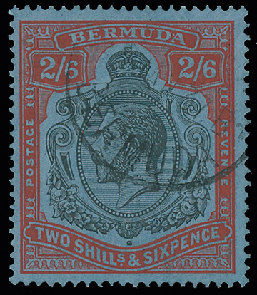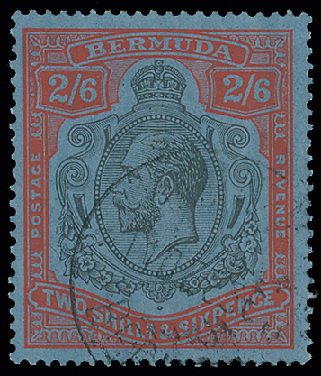 Bermuda: 1924-32 Watermark Mult. Script CA 2s.6d. black and bright orange-vermilion on deep blue, variety broken crown and scroll, used, fine. R.P.S. certificate (1992). S.G. 89kb, unpriced used. Photo. (Image1)