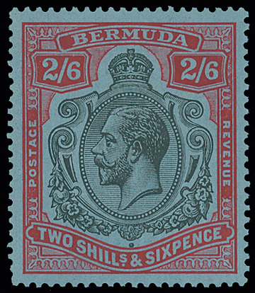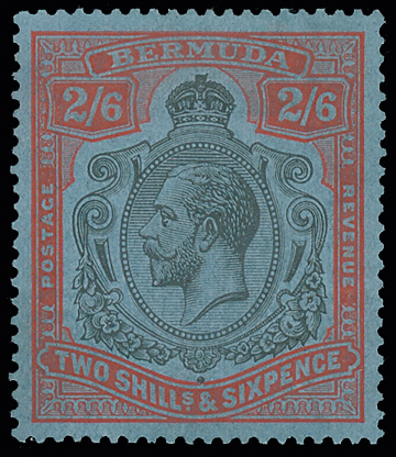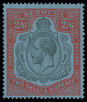 Bermuda: 1924-32 Watermark Mult. Script CA 2s.6d. black and carmine-red on deep grey-blue, variety break in lines below left scroll, mint, fine. S.G. 89ge, cat. £400. Photo. (Image1)
