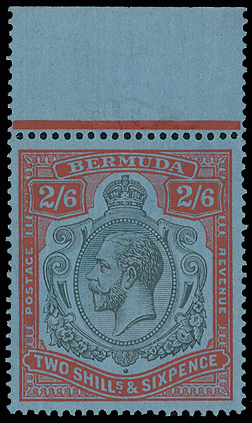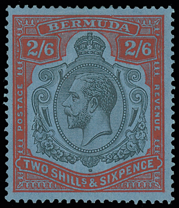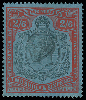Bermuda: 1924-32 Watermark Mult. Script CA 2s.6d. black and scarlet-vermilion on deep blue, variety break through scroll mint marginal example, fine. S.G. 89jd, cat. £550. Photo. (Image1)