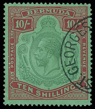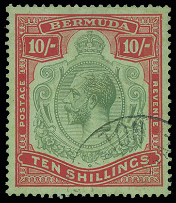 Bermuda: 1924-32 Watermark Mult. Script CA 10s. green and red on deep emerald, variety break in scroll, used, very minor corner bend, otherwise fine. S.G. 92ga, cat. £1,000. Photo. (Image1)