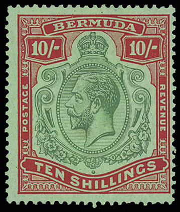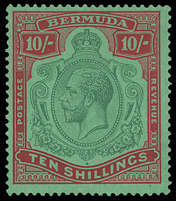 Bermuda: 1924-32 Watermark Mult. Script CA 10s. green and red on deep emerald, variety broken crown and scroll, mint, minor specks of ink on design, otherwise fine. S.G. 92b, cat. £550. Photo. (Image1)