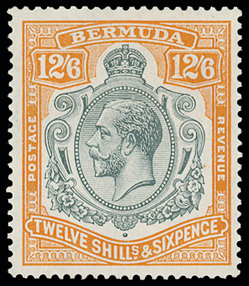 Bermuda: 1924-32 Watermark Mult. Script CA 12s.6d. grey and orange, variety break in scroll, mint, fine. S.G. 93a, cat. £600. Photo. (Image1)