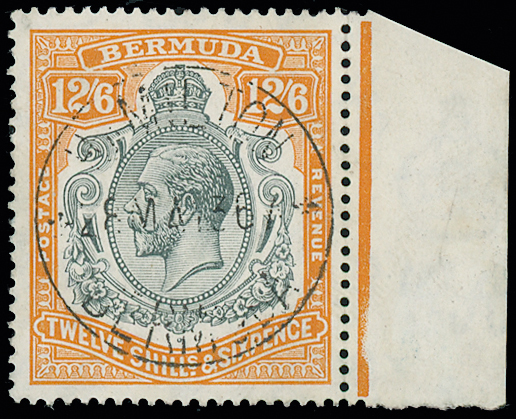 Bermuda: 1924-32 Watermark Mult. Script CA 12s.6d. grey and orange, variety broken crown and scroll, used marginal example, fine. S.G. 93b, cat. £1,000. Photo. (Image1)