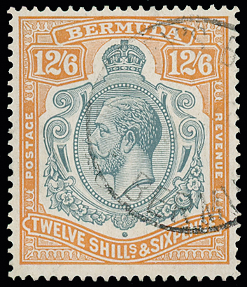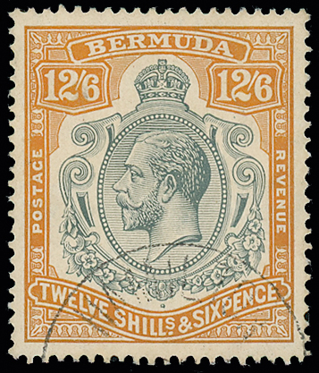 Bermuda: 1924-32 Watermark Mult. Script CA 12s.6d. grey and orange, variety break in scrolls at right used, slightly short perf., otherwise fine. S.G. 93h, cat. £1,100. Photo. (Image1)