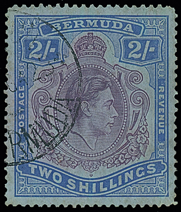 Bermuda: 1938-53 perf. 14 2s. purple and deep blue on pale blue, variety broken lower right scroll, used, fine. S.G. 116de, cat. £500. Photo. (Image1)