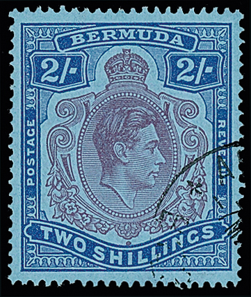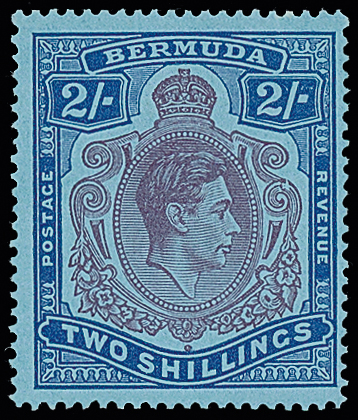 Bermuda: 1938-53 line perf. 141/4 2s. deep purple and ultramarine on grey-blue variety ‘broken top right scroll’, mint, fine. S.G. 116bd, cat. £1,500. Photo. (Image1)