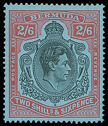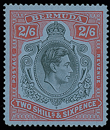 Bermuda: 1938-53 line perf. 141/4 2s.6d. black and red on grey-blue, variety lower right scroll with broken tail, unmounted mint, fine. S.G. 117ac, cat. £2,500. Photo. (Image1)