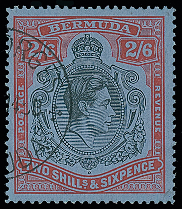 Bermuda: 1938-53 line perf. 141/4 2s.6d. black and red on grey-blue variety lower right scroll with broken tail, used, fine. R.P.S. certificate (2015). S.G. 117ac, cat. £950. Photo. (Image1)