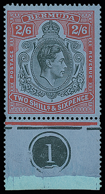 Bermuda: 1938-53 line perf. 141/4 2s.6d. black and red on grey-blue, variety broken top right scroll, mint lower marginal plate example, fine. Murray Payne certificate (undated). S.G. 117ad, cat. £1,500. Photo. (Image1)