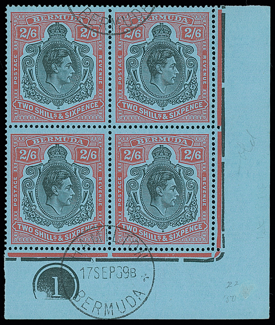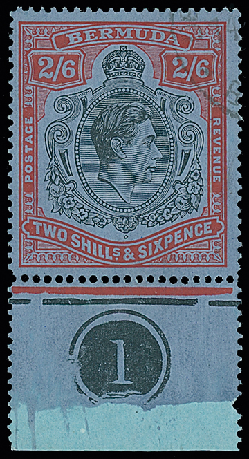 Bermuda: 1938-54 line perf. 141/4 2s.6d. black and red on grey-blue, variety broken top right scroll, used lower marginal plate example, fine. R.P.S. certificate (2016) states “cancelled by favour”. S.G. 117ad,