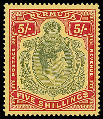 Bermuda: 1938-54 line perf. 141/4 5s. dull yellow-green and red on yellow, variety broken top right scroll, mint, fine. S.G. 118bd, cat. 950. Photo. (Image1)