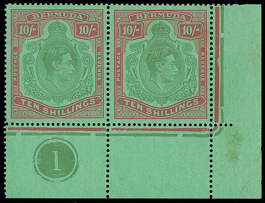 Bermuda: 1938-53 line perf. 141/4 10s. yellow green and carmine on green corner plate pair, varieties broken top right scroll and broken lower right scroll, mint, crease, otherwise fine. S.G. 119bd, be, cat.