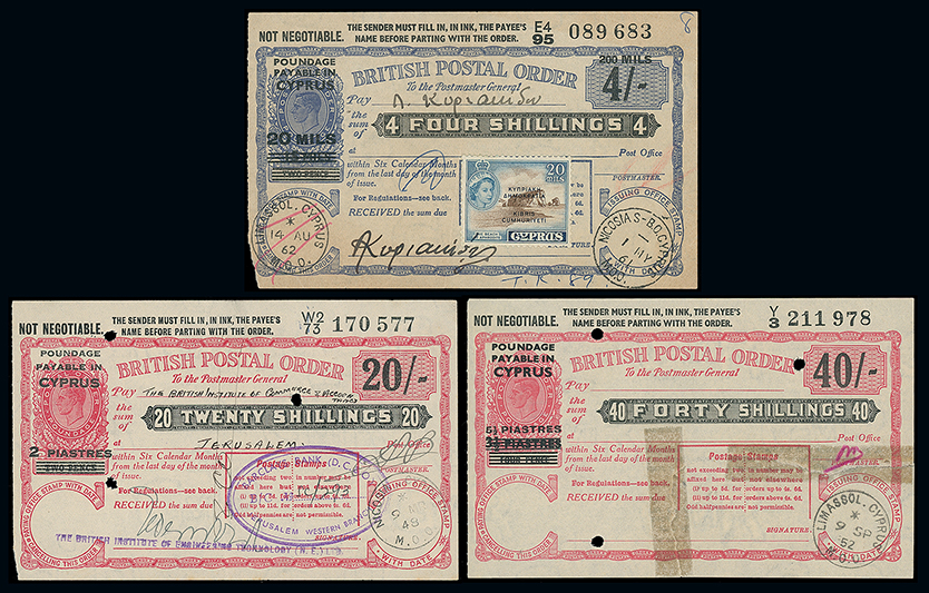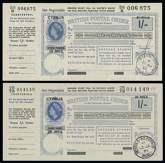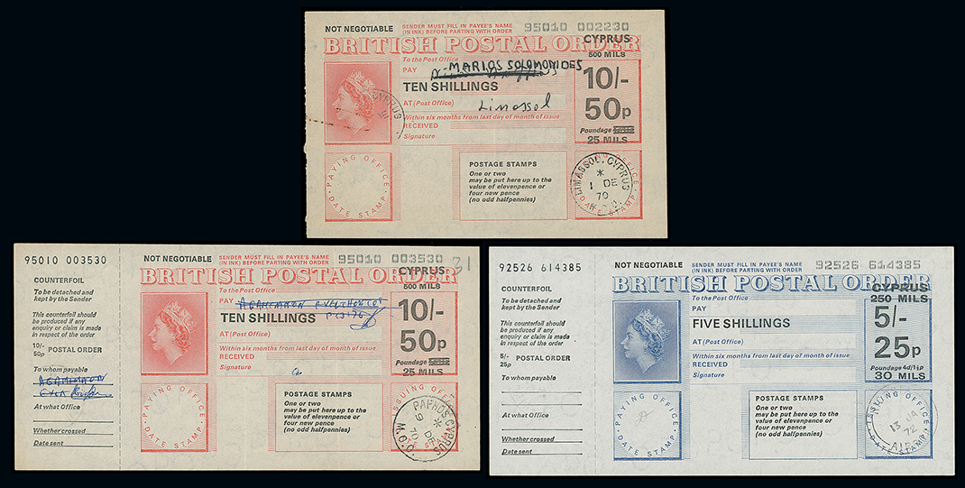 804 c, entire, etc. imageCyprus: The Christopher Podger FRPSL collection: Postal Orders: Great Britain Overprinted: Cyprus: Q.E.II decimal used postal orders comprising 1970 50p. (10s.) (3, used at Paphos, Nicosia or Larnaca), 1971 15p. (3s.), 1972 5p. (1s.), 10p., 20p. (4s.), 221/2p. and 25p. (5s.), uncommon selection. (9) Photo. (Image1)