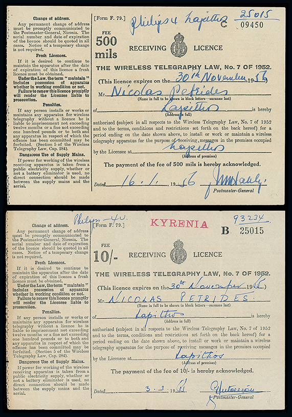 819 c, entire, etc. imageCyprus: The Christopher Podger FRPSL collection: Ephemera: Official selection incl. 1939-96 Alien Registration certificates containing passport sized photo and indicating 5s. paid for temporary residency and issued for Turkish, British, Pakistani, Greek and Palestinian Nationals, 1947-56 “Wireless” (Radio) licences for fees or 10s. or 500m., 1925 birth certificate showing 1s. fee paid, 1952 temporary (three months) driver’s licence showing 5s. fee paid also 1931-63 driver’s licences, one an international permit and a 1961 photo tobacco merchant’s licence indicating a fee of £1.500m. (34) Photo. (Image1)