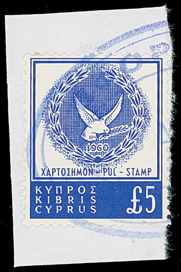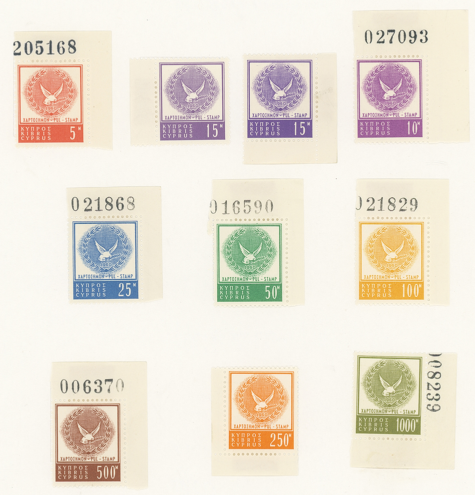 809 c, entire, etc. imageCyprus: The Christopher Podger FRPSL collection: Revenues: Republic: 1960 Dove and Wreath issues incl. mint set in singles and blocks of four, most with sheet numbers in margins, watermark varieties, used with block of 32 on a 1970 large fragment, on documents to 1000m incl. property transfers, insurance renewals, deeds, identity documents, bank drafts, receipts, share sales, etc. also a few used to pay postage on local covers or on a 1977 cover to England taxed and with G.B. postage dues, 10m. on 5m, and 10m. on 25m. surcharges, blocks overprinted “SPECIMEN” or “PENALTY” (also in Greek and Turkish) also a few 1960-61 Q.E.II overprinted issues to £1 used on documents, visas, etc. (few 100s) (Image1)