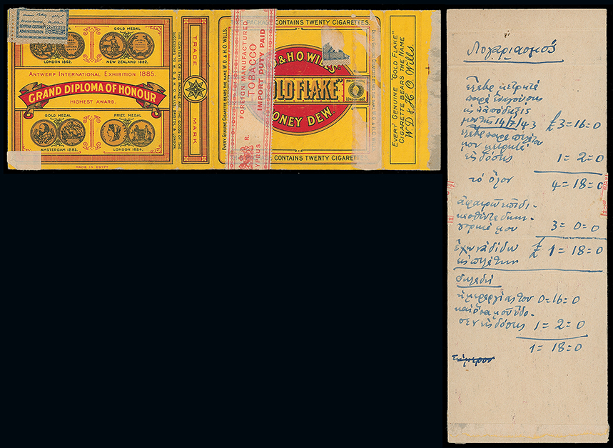 818 c, entire, etc. imageCyprus: The Christopher Podger FRPSL collection: Revenues: Tobacco: Collection incl. K.G.V banderole “FOREIGN MANUFACTURED” in red perf. 14 affixed to a packet of Egyptian cigarettes, imperf. 4 drams banderole with printed slogan “PREVENT/FOREST FIRES!” affixed to a Champion cigarette pack (opened out), imperf. 8 drams “CIGARETTES MANUFACTURED IN CYPRUS” affixed to a Lucky Dream cigarette pack (opened out) etc., scarce assembly. (18) Photo. (Image1)