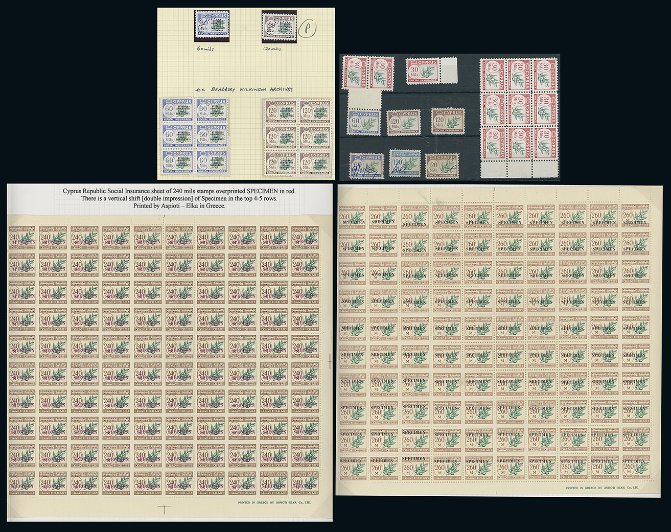 816 c, entire, etc. imageCyprus: The Christopher Podger FRPSL collection: Revenues: Social Insurance: 1956 mint set incl. 30m. marginal block block of nine, used to 120m. 1960 overprints on 60m. and 120m. in mint blocks of six and singles perforated “SPECIMEN” (ex Bradbury Wilkinson Archives), 1960 (ca.) Aspioti-Elka Greek printing bilingual (Greek/Turkish) 240m. and 260m. in sheets overprinted “SPECIMEN”, the former with two rows showing slight double impression. (approx. 500) Photo. (Image1)