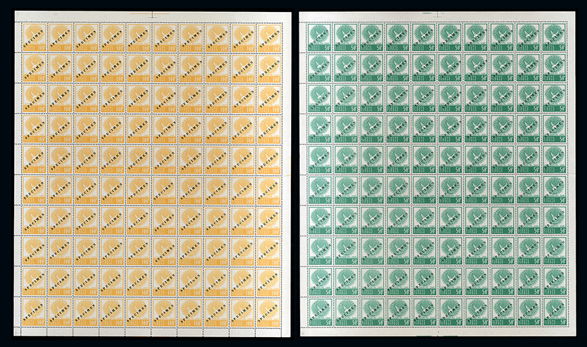 810 imageCyprus: The Christopher Podger FRPSL collection: Revenues: Republic: 1960 Dove and Wreath Harrison printing 50m. and 100m. sheets (of 100), wmk inverted and overprinted “SPECIMEN”, very fine. (200) Photo. (Image1)
