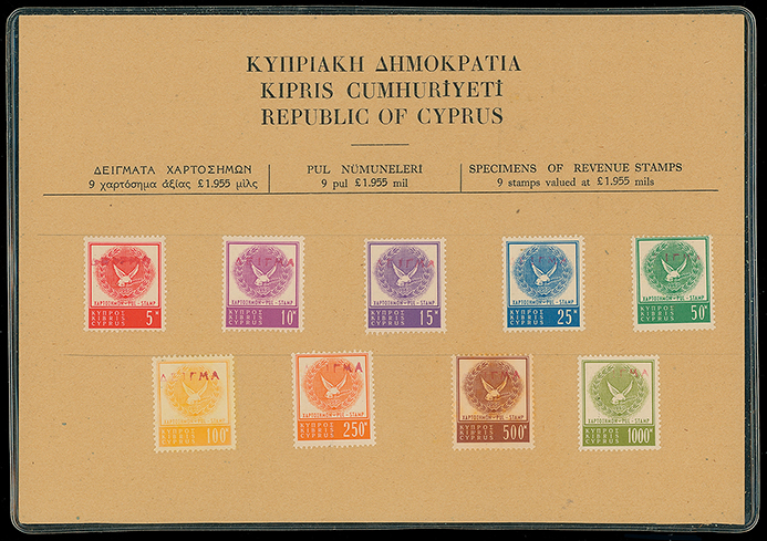811 imageCyprus: The Christopher Podger FRPSL collection: Revenues: Republic: 1960 Dove and Wreath Matsoukis (Greece) printing set affixed to a trilingual (Greek/Turkish/English) printed presentation card each overprinted “SPECIMEN” in Greek in red, very fine. Photo. (Image1)