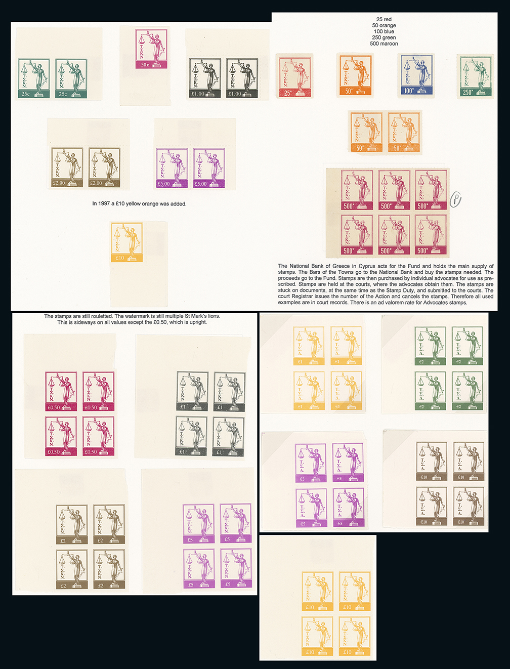 814 imageCyprus: The Christopher Podger FRPSL collection: Revenues: Republic: Advocates Pension Fund: Collection incl. 1966 rouletted mint set with 500m. in a block of six (extra 50m. in a pair), 1982 rouletted mint set in marginal pairs or singles, 1997 new values set (to £10) in mint corner blocks of four, 2008 Euro currency set in mint marginal blocks of four and a small selection of used (to £10) loose and on bank and court documents (with general Revenue issues). (approx. 100) Photo. (Image1)