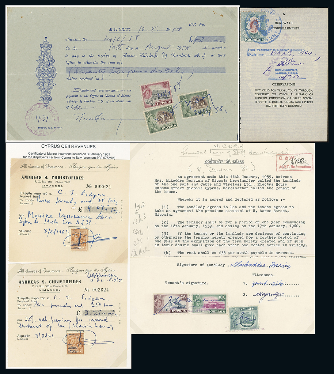 808 c, entire, etc. imageCyprus: The Christopher Podger FRPSL collection: Revenues: Q.E.II period use collection incl. 1954 promissory note franked 11/2d. (14), 1964, 1965 passport renewals franked £1, 1960 entry visas franked 250m. (2) and 500m., etc. (19) Photo. (Image1)