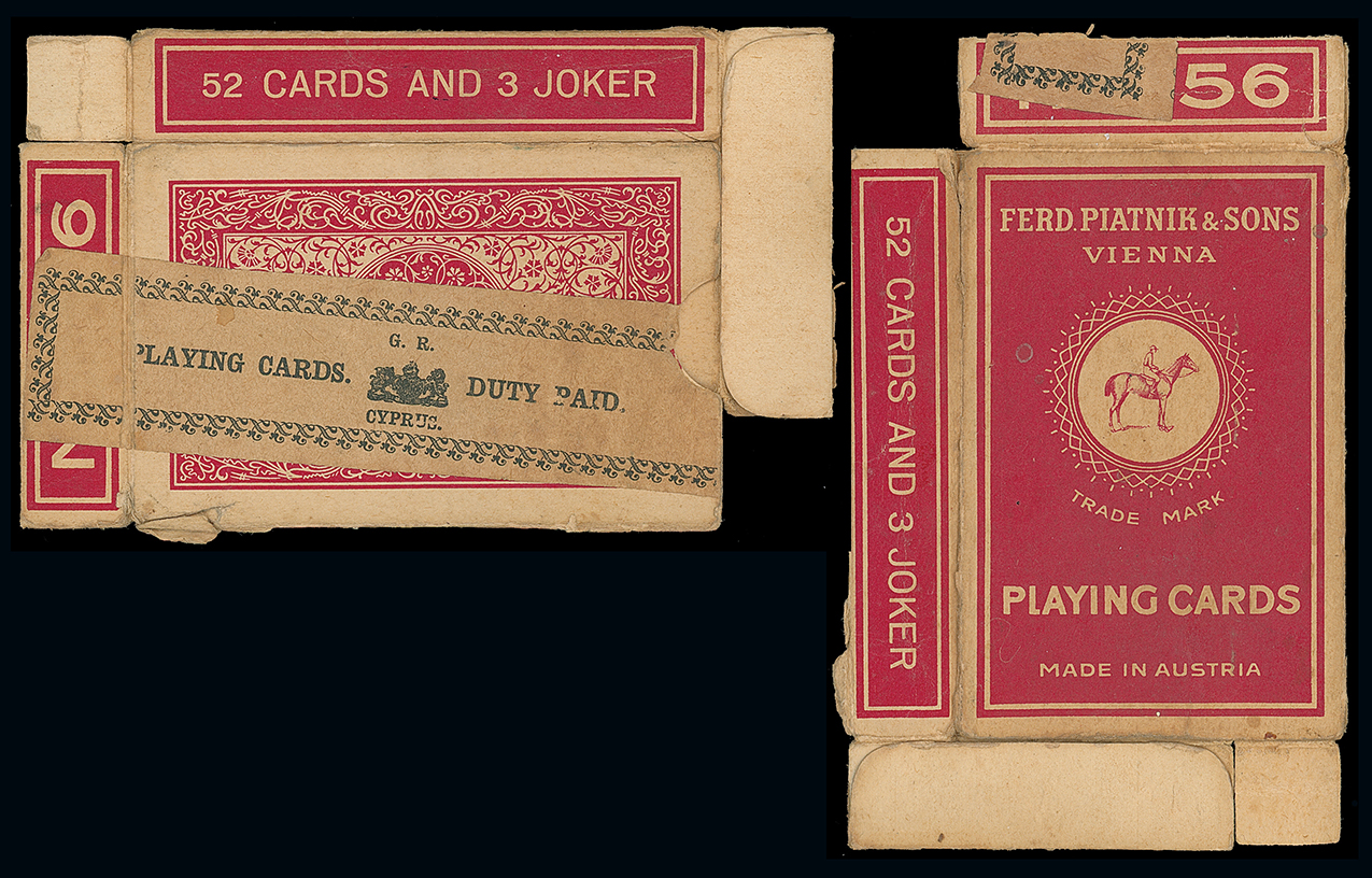 815 imageCyprus: The Christopher Podger FRPSL collection: Revenues: Playing Cards: 1927 (ca.) card package for a set of Viennese playing cards with a K.G.V imperf. on green “PLAYING CARDS/DUTY PAID” banderole affixed, the only example recorded, and a K.G.V Tobacco Duty banderole on which the design was based also three packs of playing cards (with cards) each with K.G.V perforated banderoles affixed, slight defects, scarce. (5) Photo. (Image1)