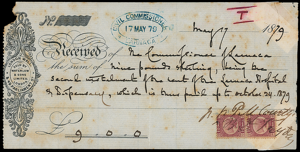 806 c, entire, etc. imageCyprus: The Christopher Podger FRPSL collection: Revenues: 1879 (May) printed receipt, slightly toned, for £9 with 1d. Stamp Duty paid by G.B. 1/2d. pair manuscript cancelled and tied at lower right and with a double oval “CIVIL COMISSIONER/LARNACA” datestamp at top. The only example of G.B. stamps used for such purpose in Cyprus. Photo. (Image1)