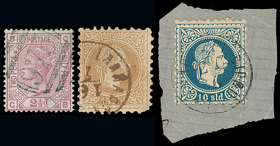 821 Used imageCyprus: G.B. 1876-80 21/2d. rosy mauve plate 14 with “975” (Limassol) bar cancellation and 1867-83 Austrian Levant 2s. 3s., 10s. and 15s. with the Austrian Lloyd Steamer “LARNACCA DI CIPRO” datestamps. (5) Photo. (Image1)