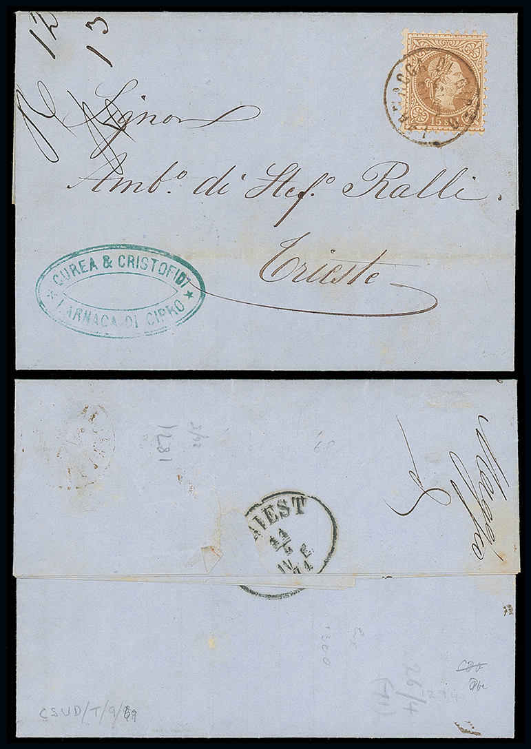 820 c, entire, etc. imageCyprus: Cancellations and Covers: Austrian P.O’s in Cyprus: 1871 entire from Larnaca to Trieste, franked by Austrian Levant 1867-76 15s. tied by “LARNACCA DI CIPRO” c.d.s., with Trieste receiving mark on reverse. Photo. (Image1)