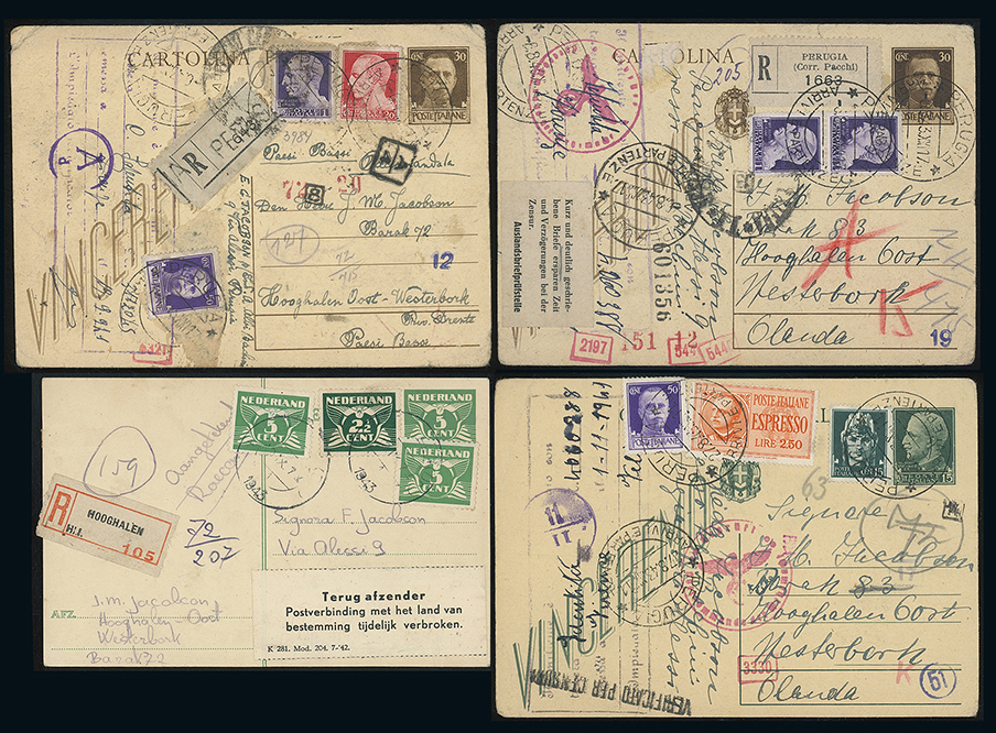 1138 imageGermany: Concentration Camps: A selection on leaves, incl. Theresienstadt cards (18) some with “ANTWORT NUR DURCH/JUD. KULTUSGEMEINDE/PRAG” cachets and banknotes (4), Buchenwald 1938 printed card, Dachau letter, registration receipts, Westerbork cards (7) and receipts, Litzmannstadt banknotes (2), etc. (42) (Image1)