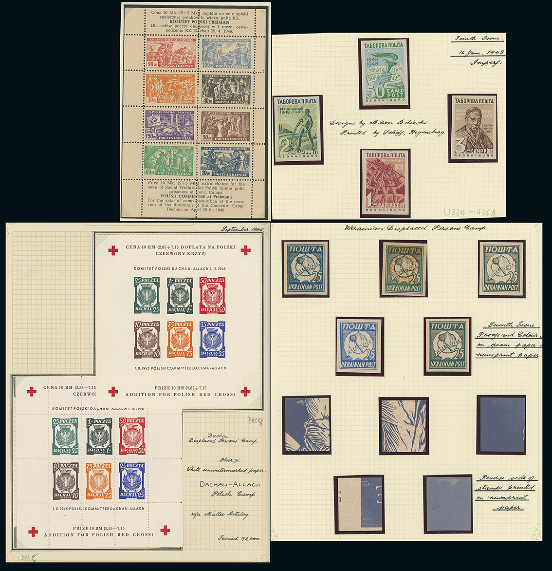 1131 imageGermany: Displaced Persons Camps: A collection of local stamps on leaves, incl. Hanau, Augsburg-Hochfeld, Geislingen, Augsburg, Detmold, Seedorf, Regensburg, Ulm-Donau, Dachau with Red Cross miniature sheets, Hellbrunn, Freiman, Lubeck, Murnau 1945 miniature sheet (certificate), a few postcards etc., fine. (few 100s) (Image1)