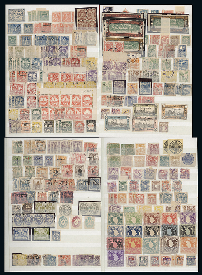 1133 imageGermany: Local Posts: An impressive specialised mint and used collection of mainly 19th century private local town posts issues in four large albums with blocks, varieties, overprints and surcharges, some covers etc., mainly good to fine. (1,000s) (Image1)