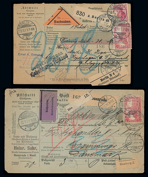 1130 imageGermany: An accumulation with ‘back of the book’ issues and covers in two cartons, incl. Allied Zones, revenues with Alsace Lorraine 1900s socials on receipt cards, Danzig, Occupations, lost colonies labels, 1911 “Gelber Hund” local air overprint 1m. on 10pf. used on piece, Feldpost labels, 1930s catapult (2) and Hindenburg Zeppelin (2) covers, 1906 cover from “Deutsch-Judisches Waisenhaus” in Jerusalem etc., varied condition. (many 100s) (Image1)