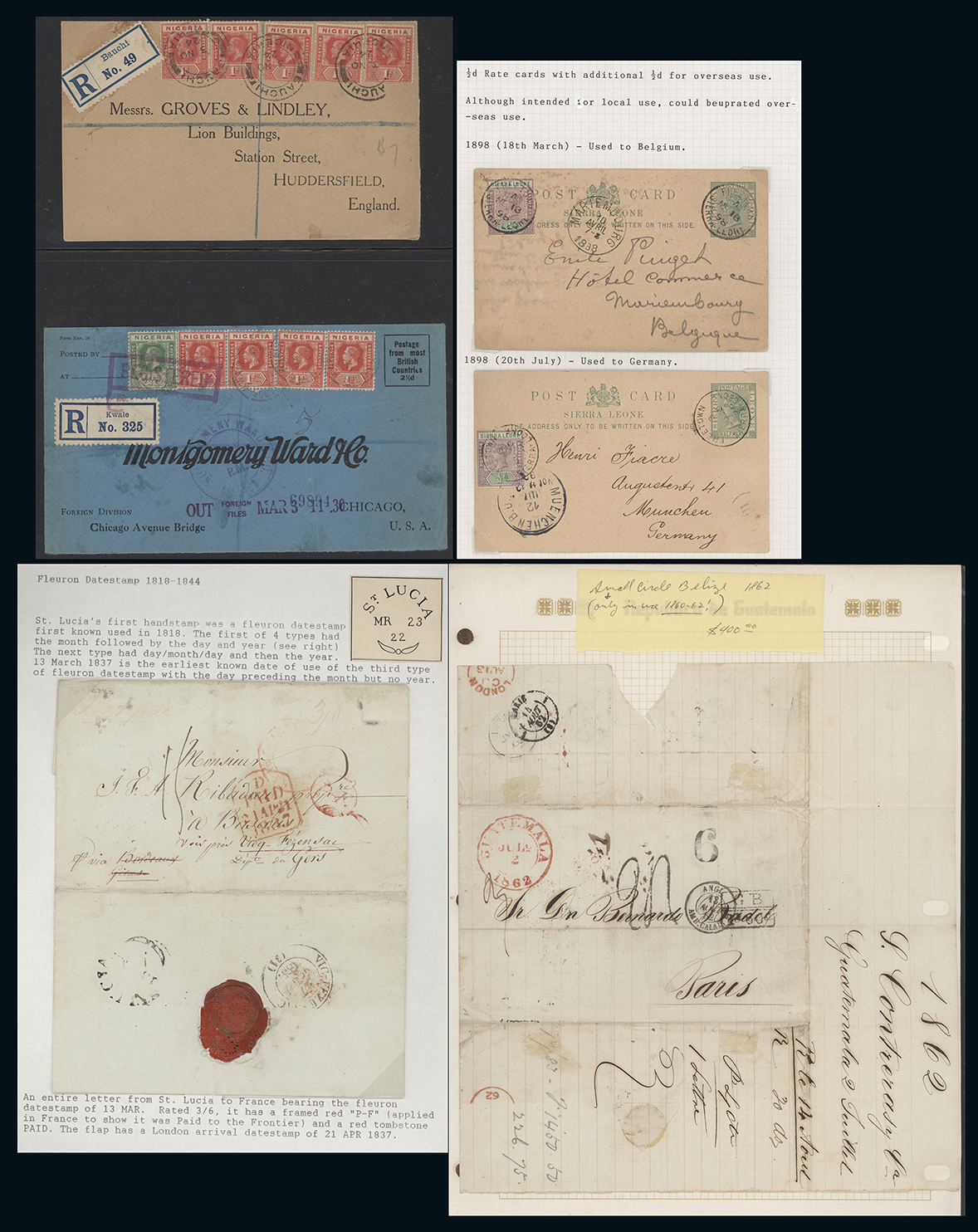 128 c, entire, etc. imagePostal History and Covers: A Commonwealth collection of covers and cards on leaves, 1822 to 1947, incl. pre-stamp British Honduras and Saint Lucia, Q.V. Bechuanaland, Sierra Leone, Br. Guiana, Malta registered letter receipts, Nigeria K.G.V, W.W.II censored and U.S. A.P.O. 877 (Ascension), etc. (111) (Image1)